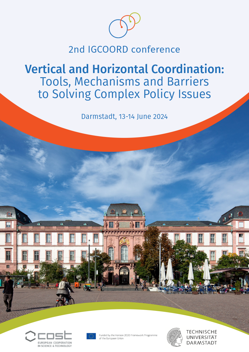 Organized by COST Action 20123 - Intergovernmental Coordination from Local to European Governance (IGCOORD). “Vertical and Horizontal Coordination: Tools, Mechanisms and Barriers to Solving Complex Policy Issues” - 13-14 June 2024, TU Darmstadt, Germany.